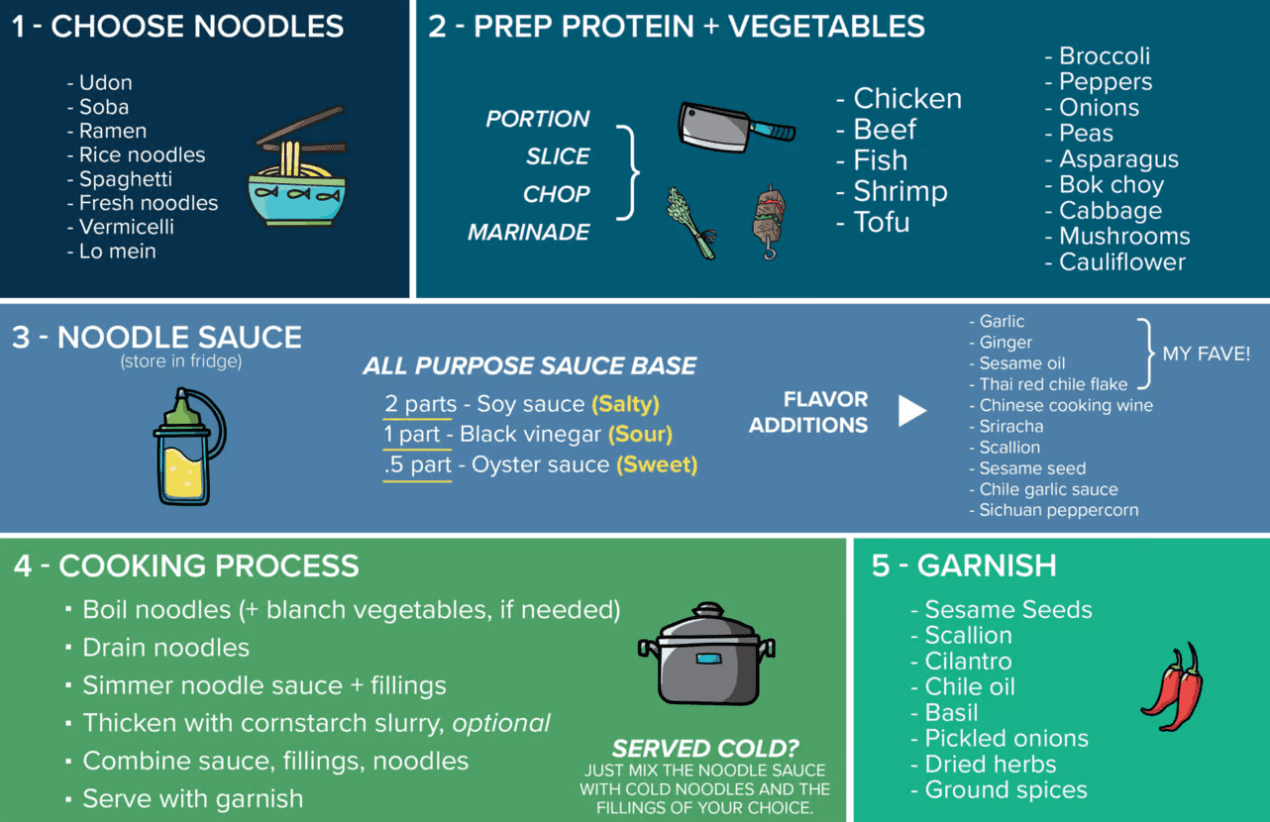 The graphic says it all: keep some noodles on hand, use whatever protein and vegetables you have around, cook and sauce everything together, then garnish.